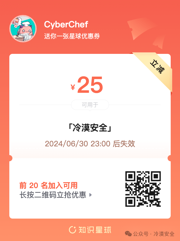 知识星球:冷漠安全交个朋友,限时优惠券:加入立减25星球福利:每天更新最新漏洞POC、资料文献、内部工具等