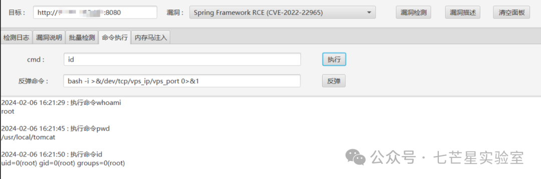 Spring Framework RCE (CVE-2022-22965) 目前支持命令执行,通过写入webshell实现的,后续会继续实现写入ssh公钥、计划任务等利用方式