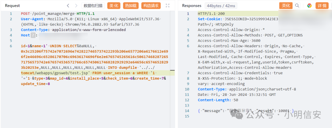 通天星CMSV6车载定位监控平台/point_manage/merge接口存在SQL注入漏洞,攻击者可以通过漏洞获取服务器内敏感信息导致信息泄露,甚至通过漏洞写入木马病毒获取服务器权限。
