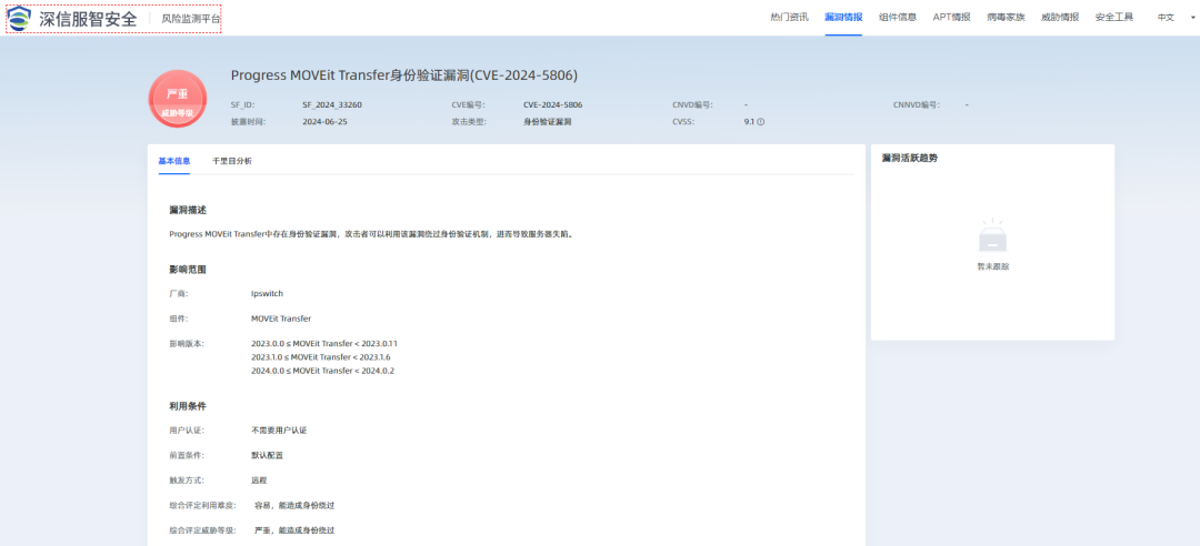 深瞳漏洞实验室监测到Progress MOVEit Transfer身份验证漏洞信息。