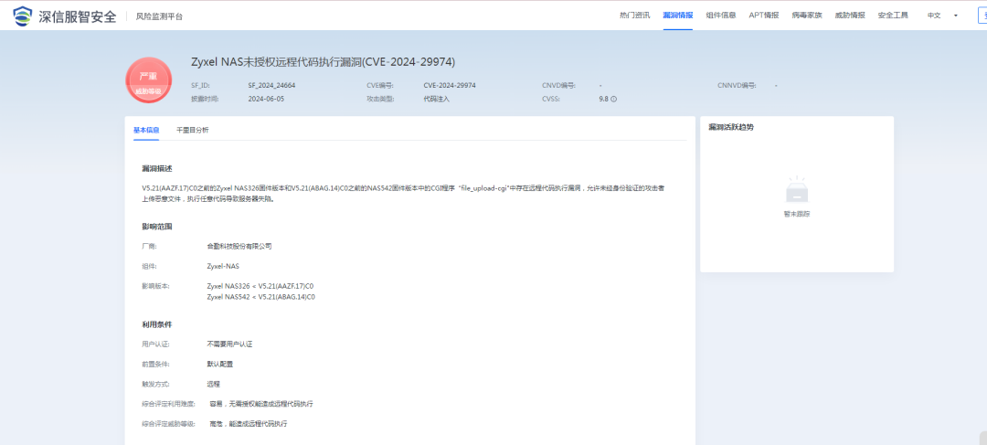 2024年6月6日,深瞳漏洞实验室监测到一则Zyxel-NAS组件存在代码注入漏洞的信息,漏洞编号:CVE-2024-29974,漏洞威胁等级:严重。