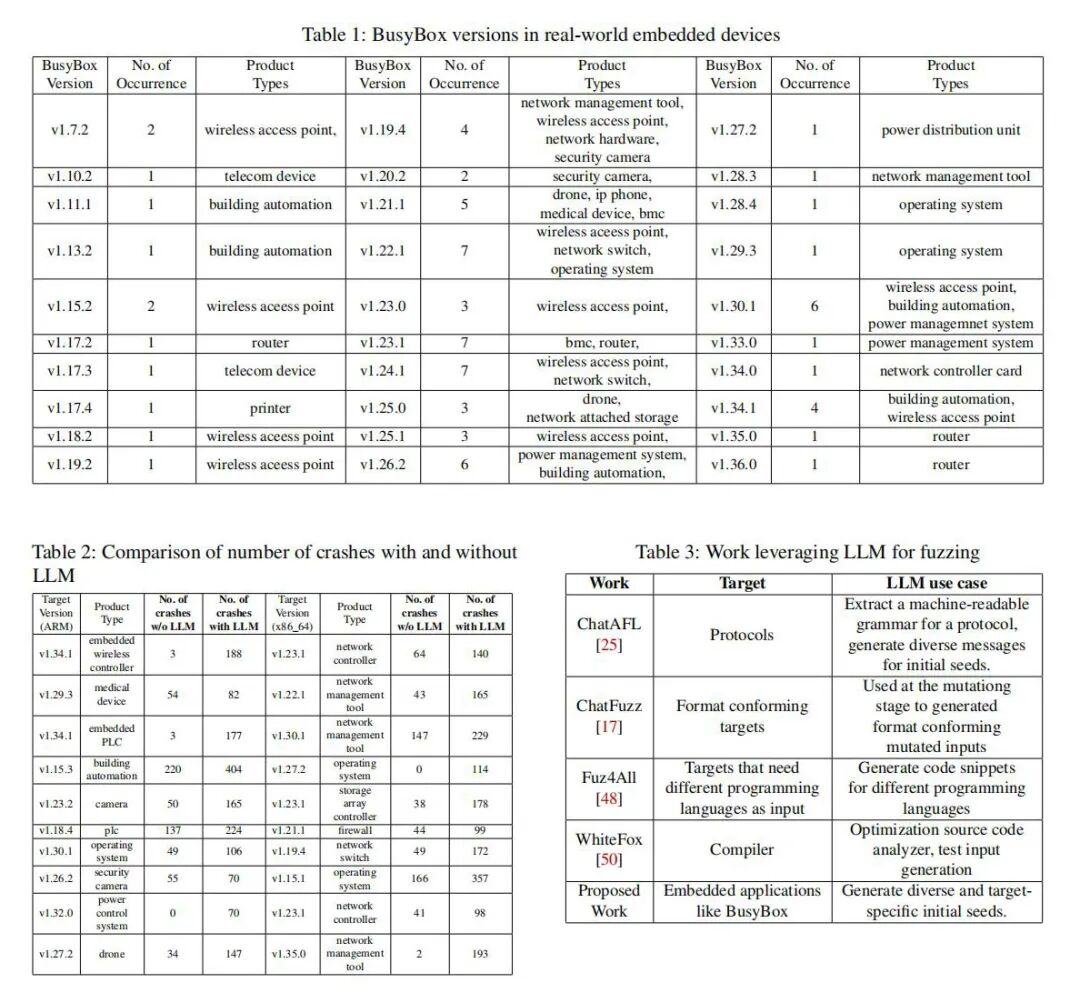 第一种技术利用大语言模型(LLM)生成目标特定的初始种子,大幅度提高了崩溃数量,展示了LLM在生成高效种子方面的潜力。第二种技术是重用先前获取的崩溃数据,这一策略能够在不进行传统模糊测试的情况下识别最新BusyBox版本中的崩溃,从而有效提升软件测试和嵌入式系统漏洞检测的效率。