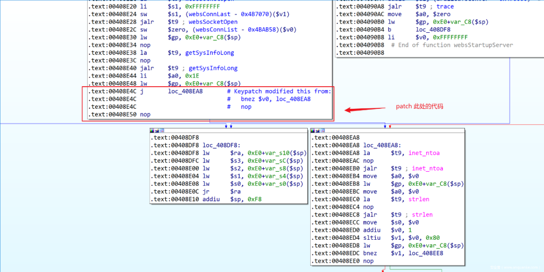 如下是 websStartupServer 的地址判定处反编译,以及 patch 的基本块: