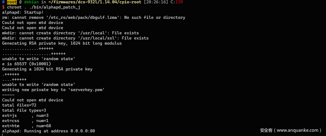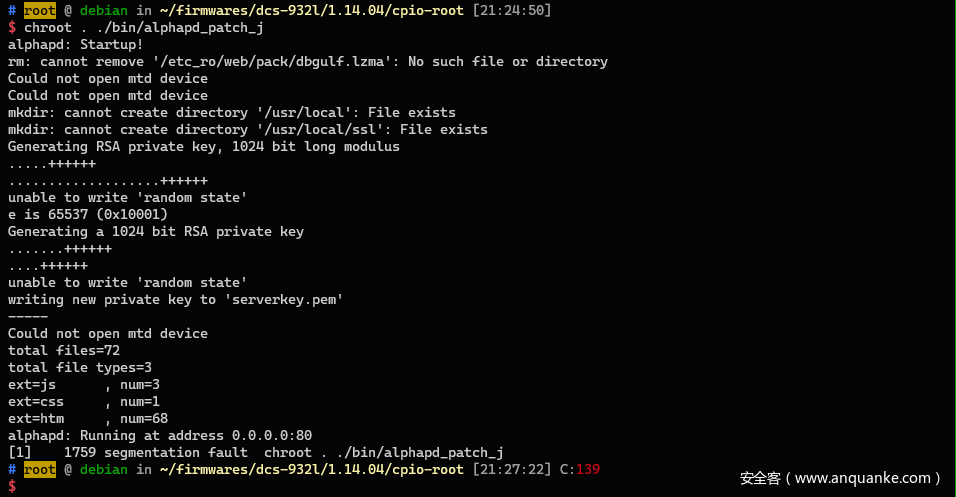 根据逆向中的反编译代码提示,是因为需要打开 /var/run/nvramd.pid 文件,那么在固件根目录创建 run 目录和 nvramd.pid 文件。