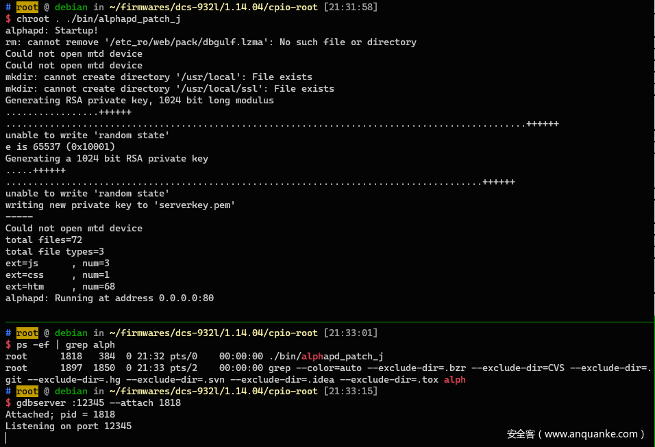 在 QEMU 虚拟机中开启 alphapd,然后使用 gdbserver attach 上 server 的进程,通过 12345 端口提供调试