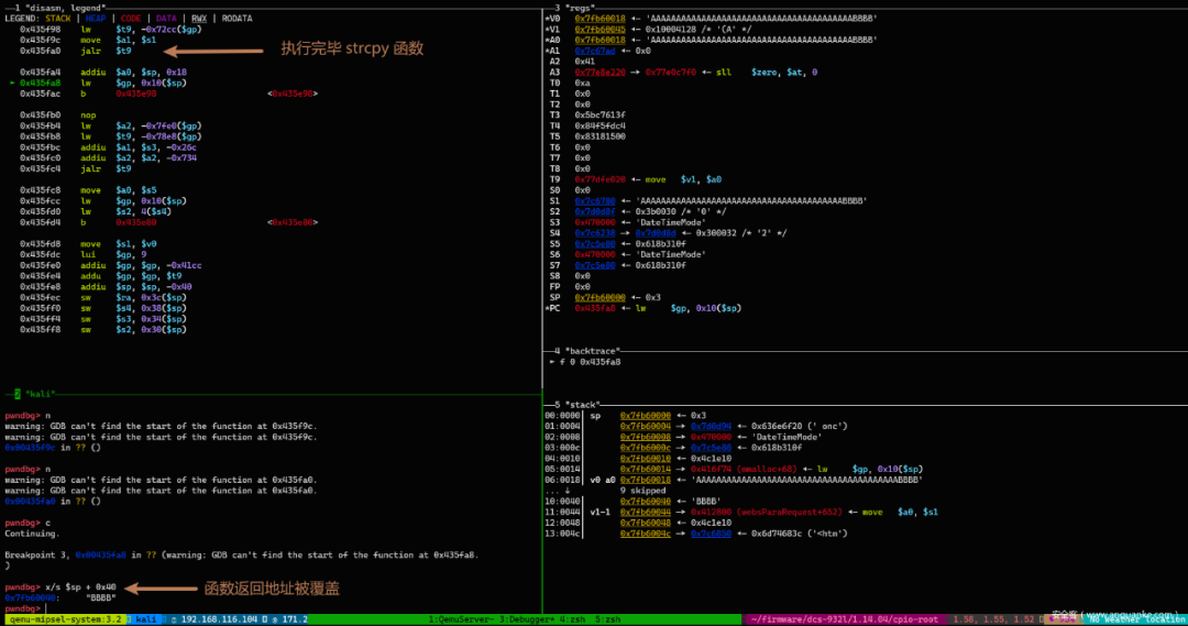 对后端服务器程序 alphapd 进行分析,存在漏洞的函数是 sub_435DEC,开辟的栈帧大小是 0x48,其中该函数的返回地址保存在 sp + 0x40,存在溢出的缓冲区起始地址是 sp + 0x18。因此,只需要向缓冲区写入超过 0x28 个字节就可以溢出覆盖返回地址,劫持控制流。除此之外还可以控制 S0~S5 寄存器。