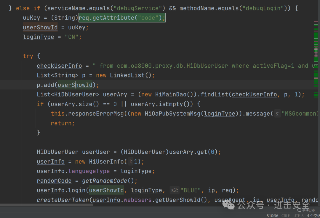 在其中的dopost方法当中接收一个用户传入的参数为code参数,并且给到了变量userShowId变量。