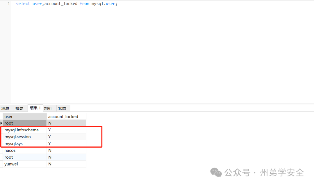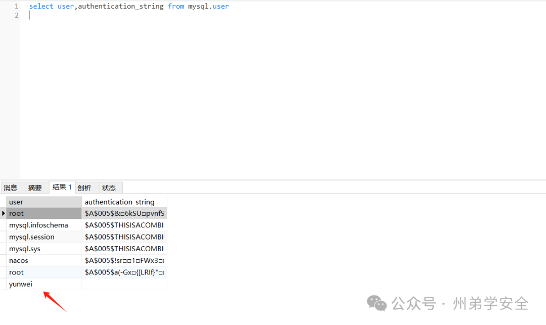 select user,authentication_string from mysql.user 查询到空口令的用户