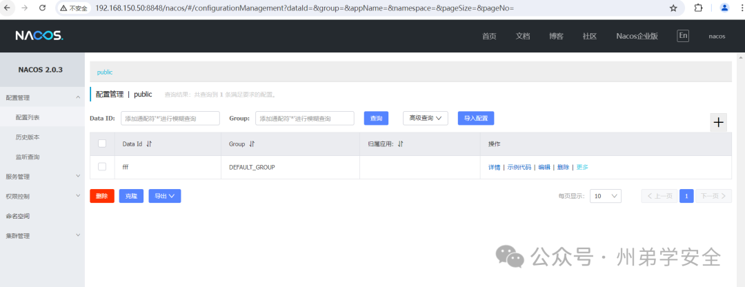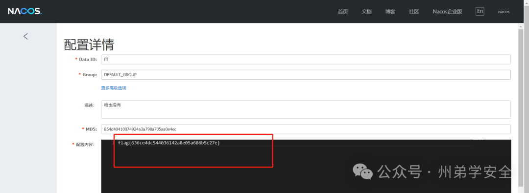 在配置列表中,Data ID名为fff的配置项,点击详情,查看到敏感信息,此处以flag代替