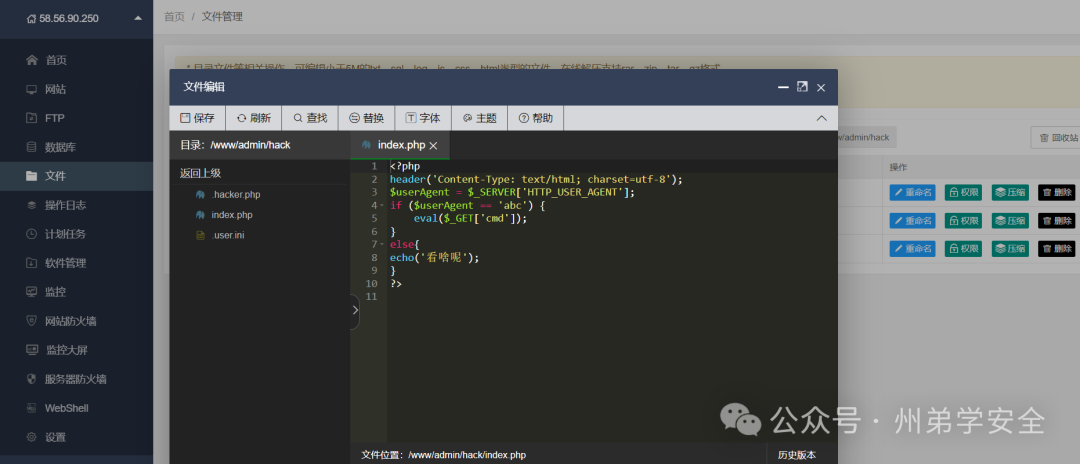 文件存在一句话木马执行,执行前会检查UA,不是对应UA则不执行