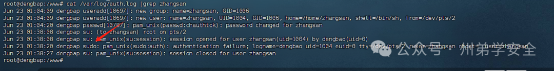** 审计相关日志,查看zhangsan用户尝试使用sudo但登录失败的日志,提交其时间,如flag{Jun 23 00:39:52}