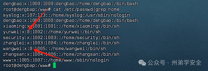 一步步排查,先排查可登录用户,再排查用户的权限,发现用户yunwei和wangwei具有root权限,我们可以找到相关人员核实