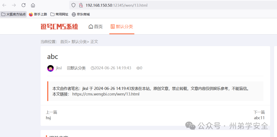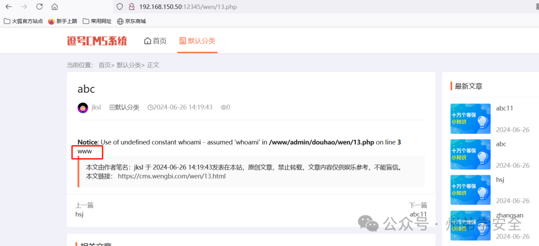 然后将url编码替换掉info的的数据,放包后文章写入成功,这时候需要访问前台,在前台页面访问创建的那个文章以产生缓存,此时因开启了缓存,会将此代码以php的方式写入到wen目录下