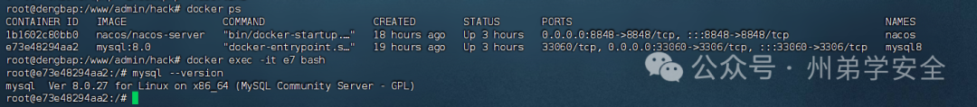 因为使用的是docker搭建的,命令行查询需进入容器内部,执行命令: