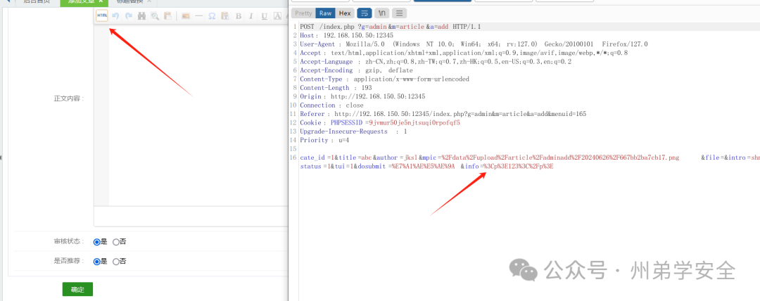 我们根据道一师傅给出的漏洞思路进行复现,开启缓存后,点击发布文章,抓包后找到info参数,此时需要将恶意代码进行url编码以绕过前端过滤
