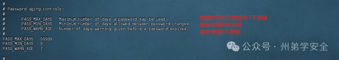 为了遵守安全合规性,在登录配置文件中,设置了密码最长与最短使用时间,包括提前多少天提醒用户更新密码设置,使用以下命令查看相应规则: