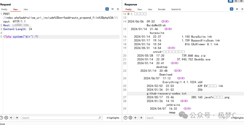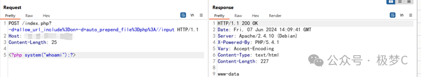 urlcode编码中%3D为=,%3A为: -d allow_url_include=on控制允许在include、include_once、require、require_once等函数中使用URL作为文件名,可以远程url加载执行php代码-d auto_prepend_file=php://inputphp://input流通常用于读取POST数据,而-d auto_prepend_file则指定了包含的php脚本为POST输入