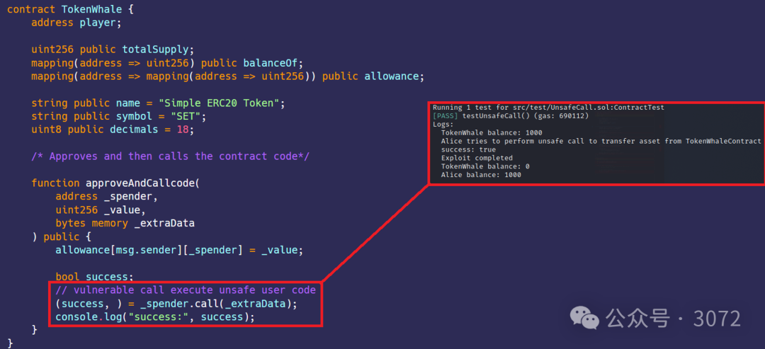 // Alice尝试对TokenWhaleContract进行不安全的调用以转移资产