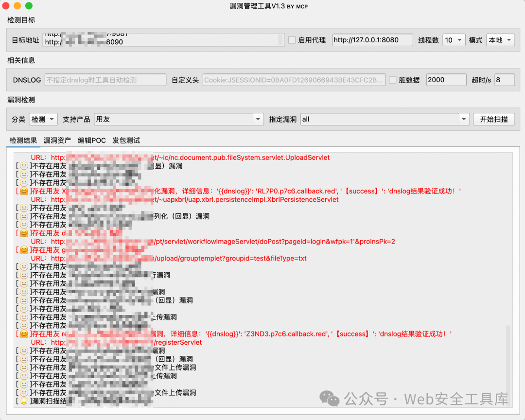 支持对一条或多条URL漏洞扫描,同时可以自定义一些信息,例如:自定义头、添加脏数据、启用代理、线程数、超时时间等。