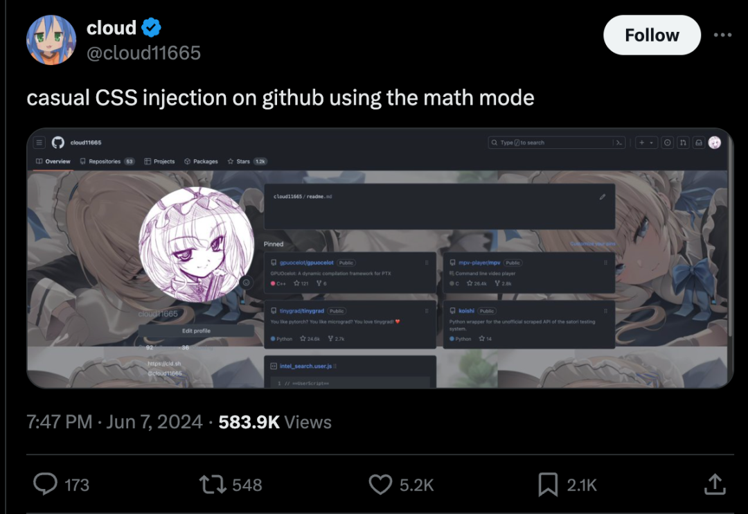 MathJax 时可以插入自定义的 CSS 样式。虽然 GitHub README 也偶有 XSS 的报告,但由于 CSP,比较难利用。