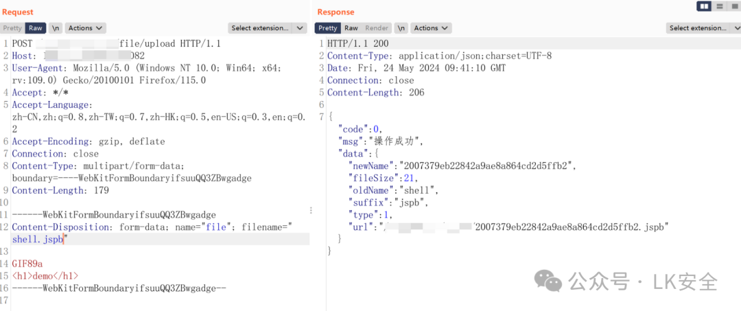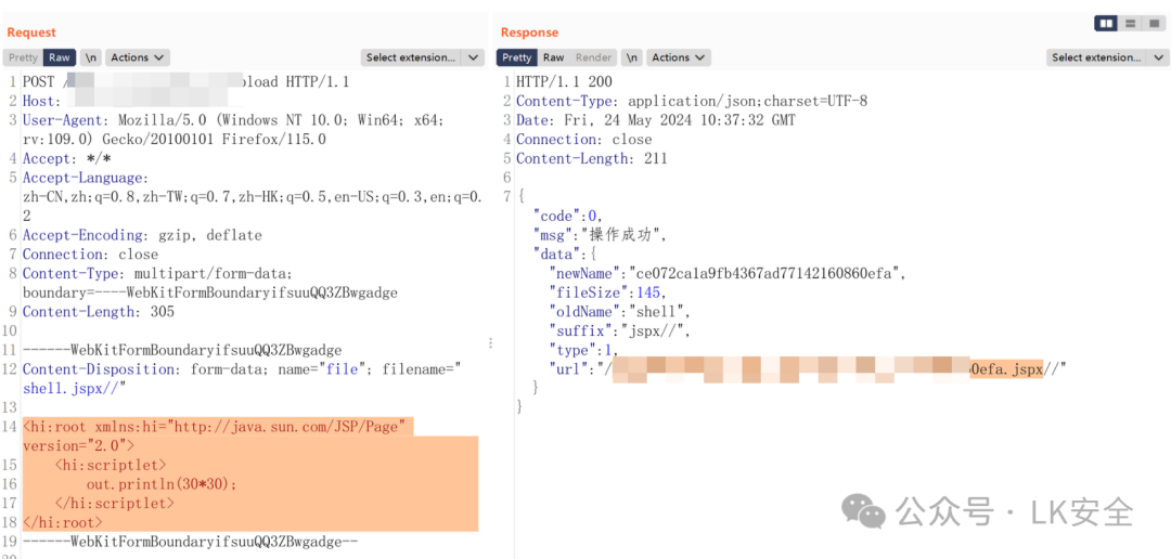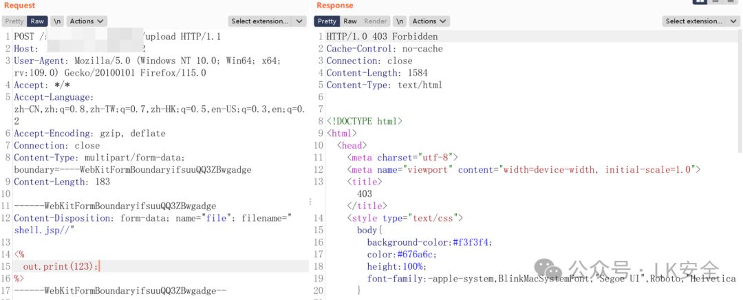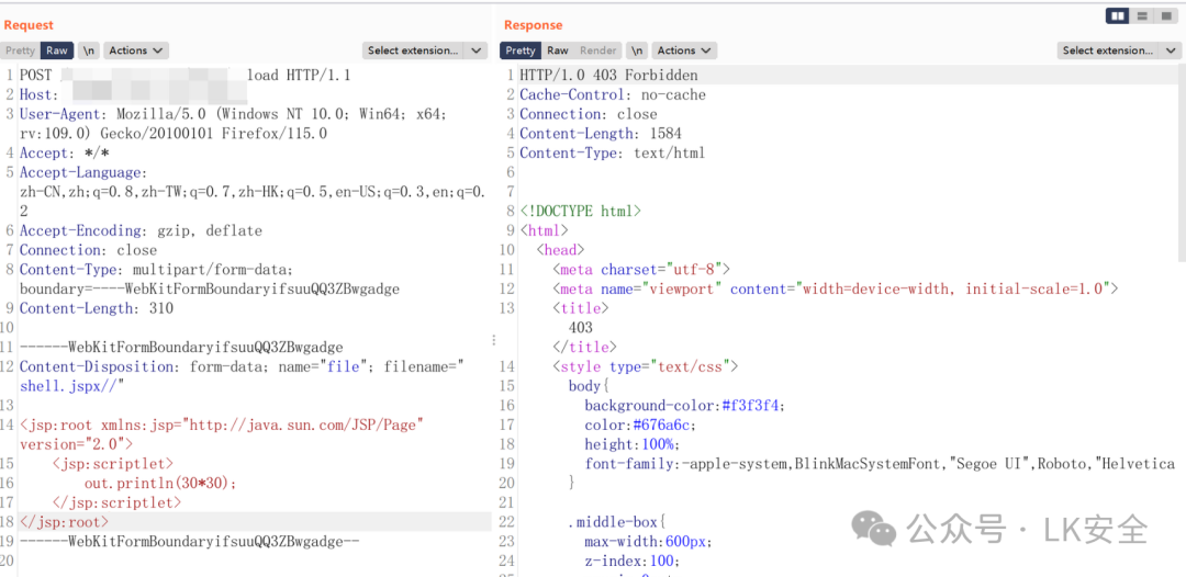 尝试jsp、jspx、jspf等后缀,会报403,但是对于jspb这类不会被正常解析的后缀却能成功上传。