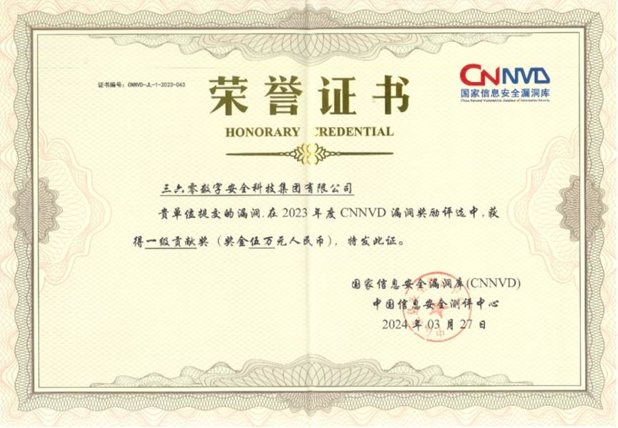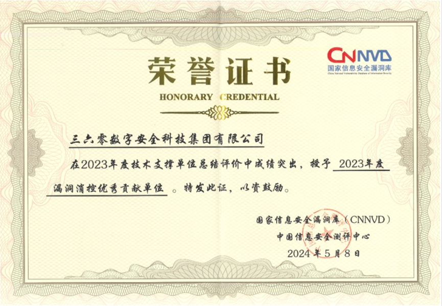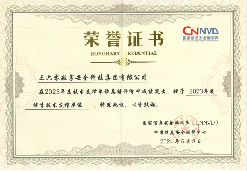 作为CNNVD的一级技术支撑单位之一,360数字安全集团积极向CNNVD提供原创漏洞报送、漏洞通报、漏洞分析、漏洞响应等高质量技术服务。近年来,360数字安全集团接连获得“年度优秀技术支撑单位”、“最佳新秀奖”、“一级技术支撑单位”等表彰。