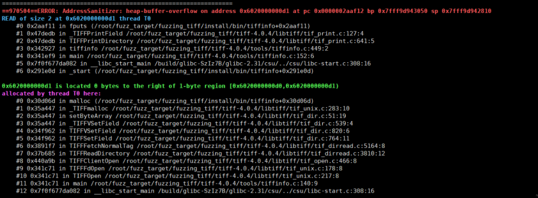 报错信息:AddressSanitizer: heap-buffer-overflow (/root/fuzz_target/fuzzing_tiff/install/bin/tiffinfo+0x2aaf11) in fputs,堆溢出。