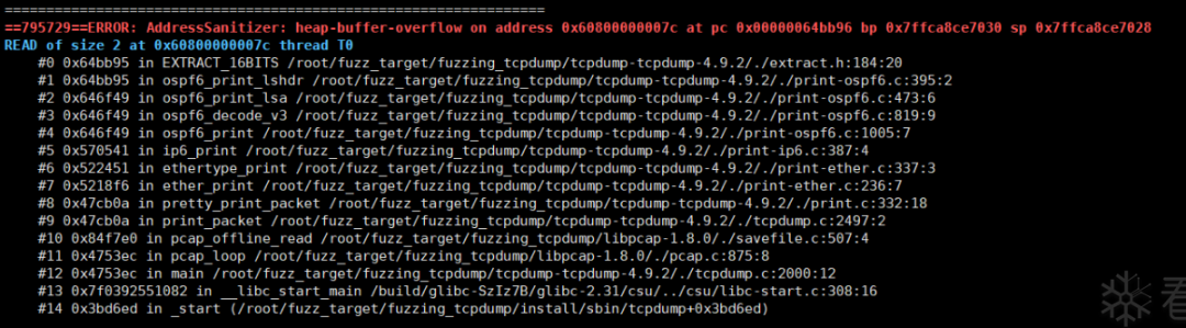 报错信息:AddressSanitizer: heap-buffer-overflow /root/fuzz_target/fuzzing_tcpdump/tcpdump-tcpdump-4.9.2/./extract.h:184:20 in EXTRACT_16BITS,直接说明是堆溢出。