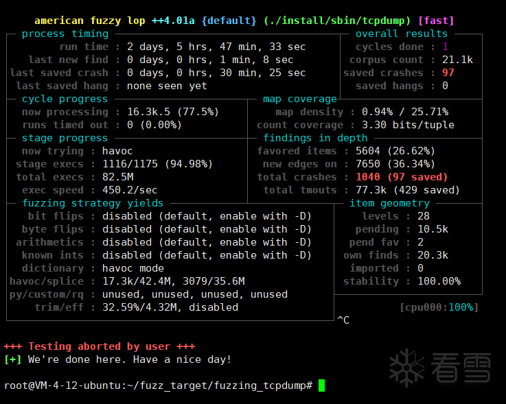 afl-fuzz -m none -i ./tcpdump-tcpdump-4.9.2/tests/ -o ./afl_out/ -s 123 -- ./install/sbin/tcpdump -vvvvXX -ee -nn -r @@