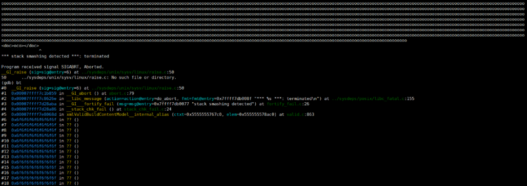 漏洞位置__GI_raise (sig=sig@entry=6) at ../sysdeps/unix/sysv/linux/raise.c:50,找到问题代码。