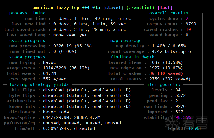 afl-fuzz -m none -i ./afl_in -o afl_out -s 123 -x ./dictionaries/xml.dict -D -M master -- ./xmllint --memory --noenc --nocdata --dtdattr --loaddtd --valid --xinclude @@