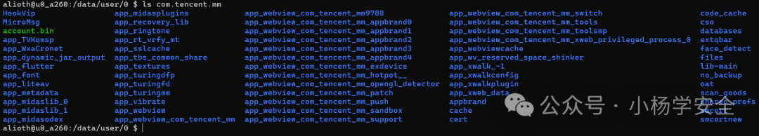 可见此时的 shell 已经是微信 UID 了。通过命令也可查看目标应用数据(其它应用没有权限),如图所示:
