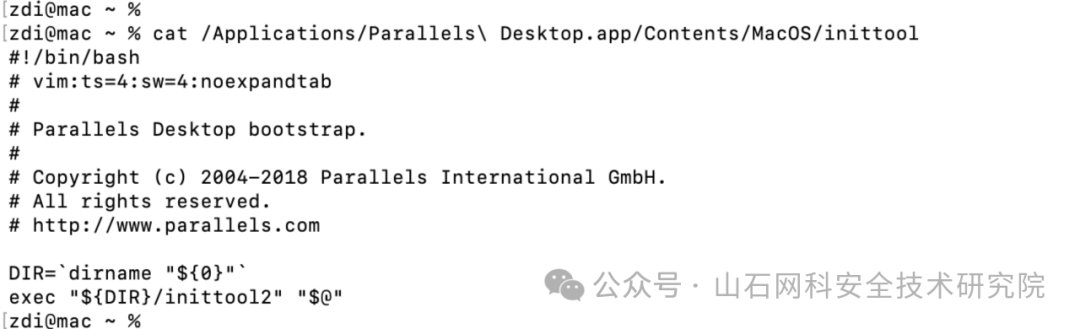 – CVE-2023-27324 (ZDI-23-218)和 CVE-2023-27325(ZDI-23-219),通过Parallels Updater进行本地权限提升。这两处漏洞是在Parallels Updater prl_update_helper 二进制文件中发现的。在CVE-2023-27324中,prl_update_helper 二进制文件调用一个名为 inittool 的bash脚本,而无需设置特权模式: