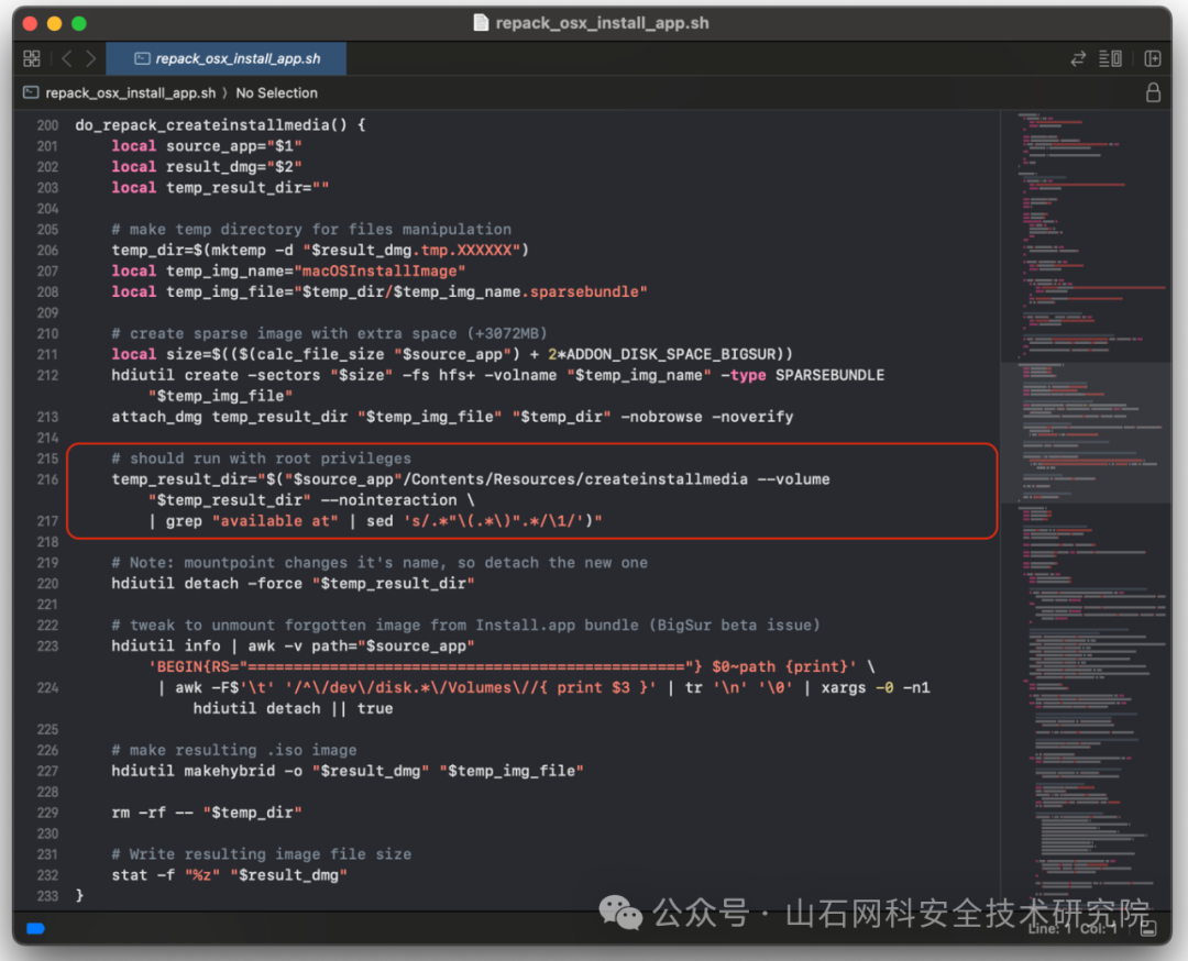 在使用 Parallels 的大规模部署包进行测试时,使用了2018年款的 Intel Mac mini 和一个 macOS 虚拟机。在测试过程中注意到一个奇怪的现象,那就是在创建 macOS 虚拟机时,从未出现过密码提示。这不符合常理,因为Parallels 使用了苹果的 createinstallmedia程序,此程序需要 root 权限。经过进一步检查,通过一个名为 repack_osx_install_app.sh 的脚本确认了这一点,该脚本位于 Parallels Desktop.app/Contents/Resources 下: