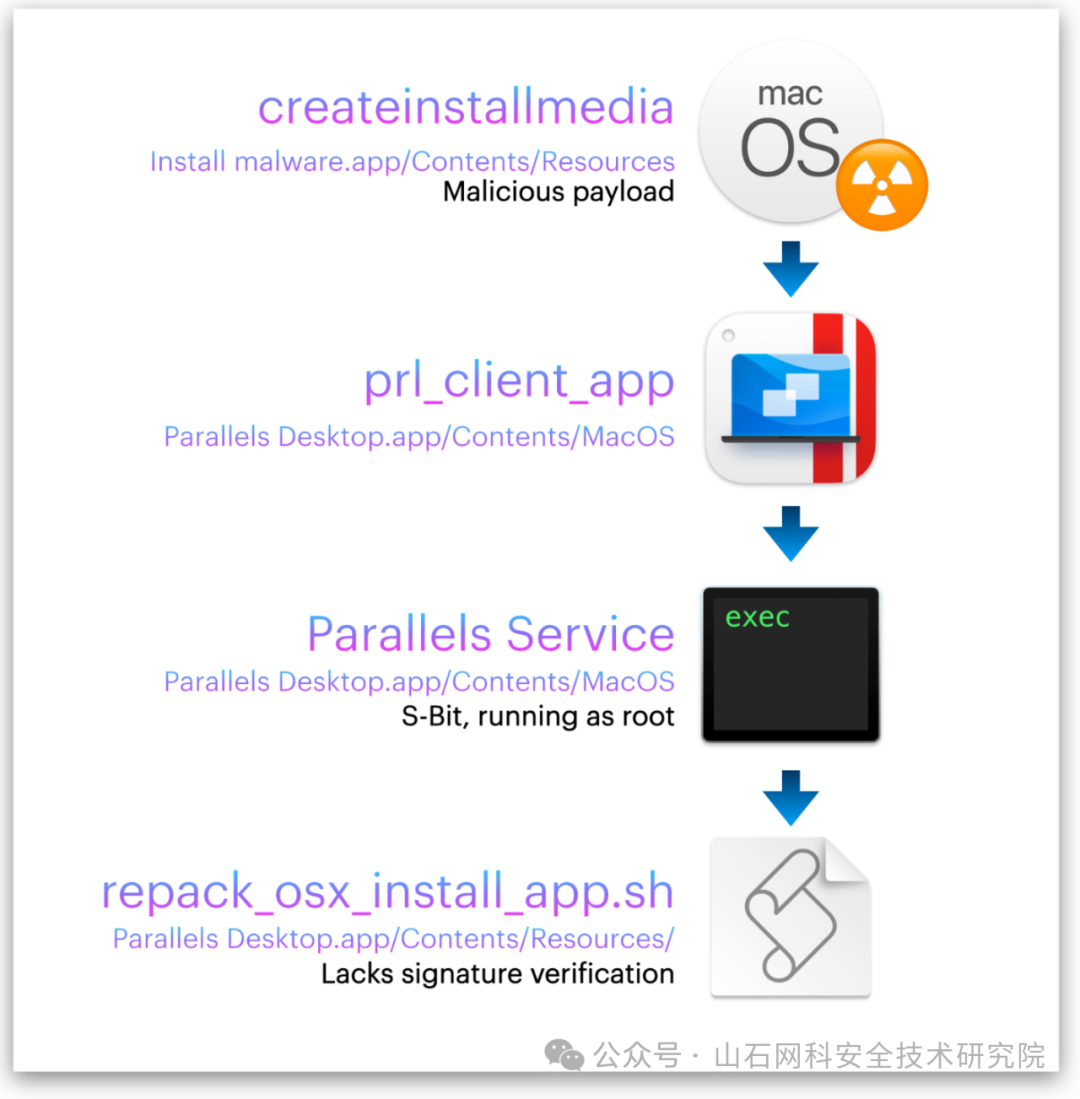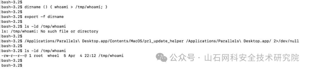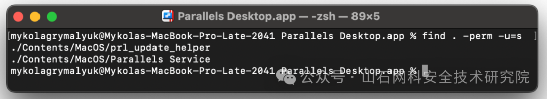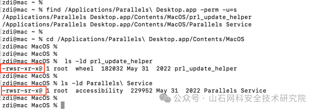 更多细节可以参考链接 [3] 的文章,其中详细解释了SUID导致的 Parallels 提权问题。