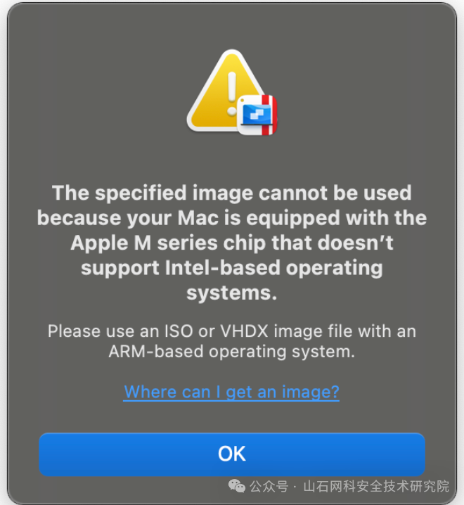 这些漏洞都基于createinstallmedia程序,而M系列芯片的macOS Parallels软件中,createinstallmedia实际上并没有在repack_osx_install_app.sh中被调用。相反,它使用hdiutil创建类似于VMware Fusion的磁盘映像。并且Parallels添加了对基于createinstallmedia的虚拟机的支持,同时检查主机是否可以使用它,所以不会在M系列芯片平台的Mac上触发漏洞。以下错误消息是由ParallelsVirtualizationSDK.framework在M芯片Mac上尝试使用macOS安装程序时生成的: