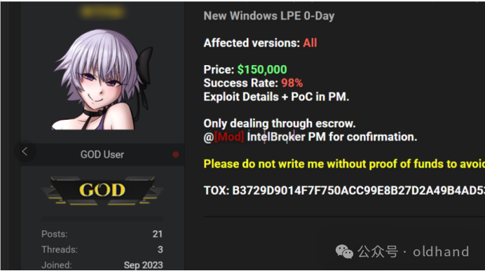 一名威胁行为者声称正在出售新的Windows LPE 0-day。
