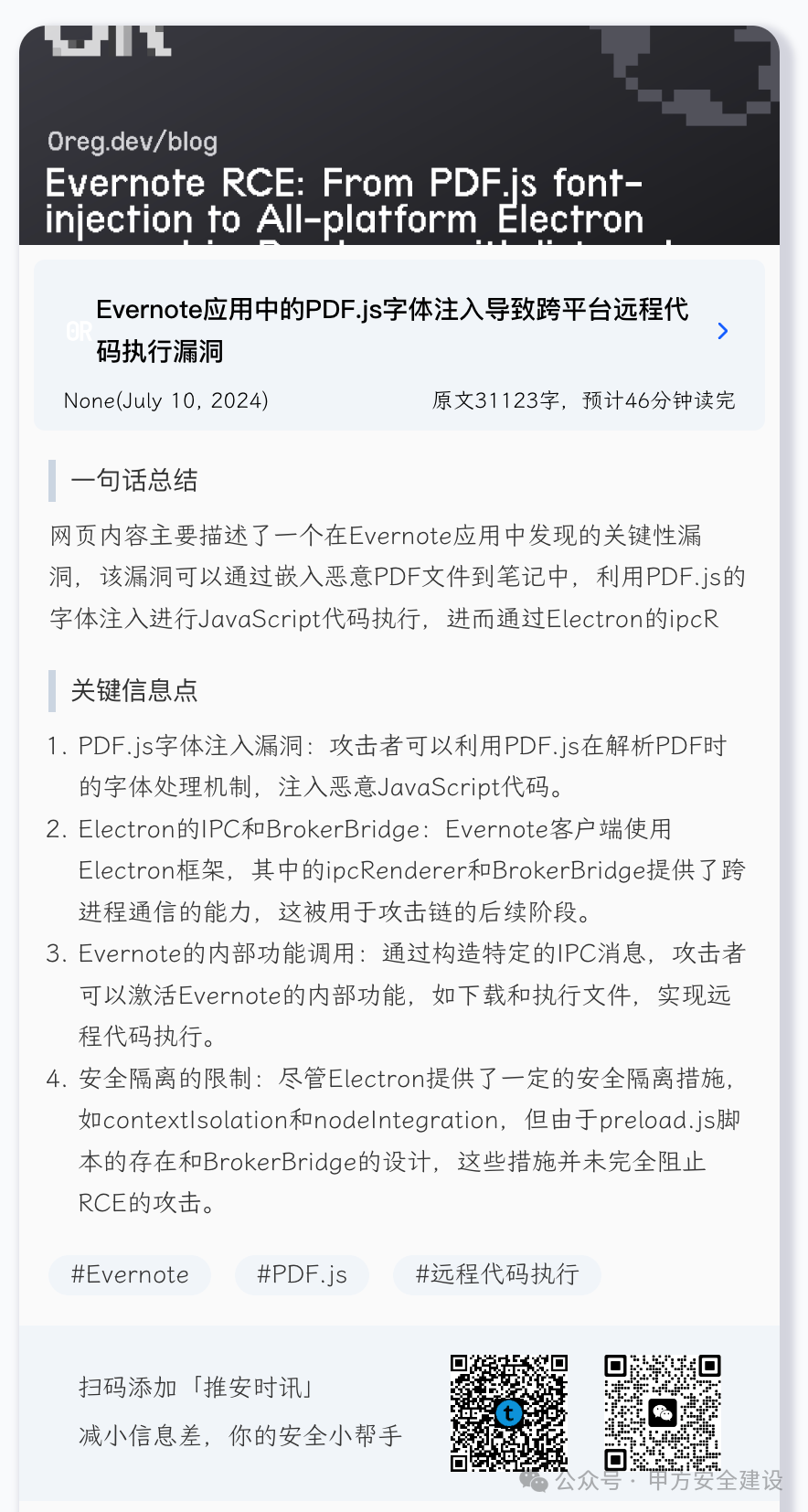 主要描述了一个在Evernote应用中发现的关键性漏洞,该漏洞可以通过嵌入恶意PDF文件到笔记中,利用PDF.js的字体注入进行JavaScript代码执行,进而通过Electron的ipcRenderer和BrokerBridge实现跨进程通信,最终达到远程代码执行(RCE)的攻击链。