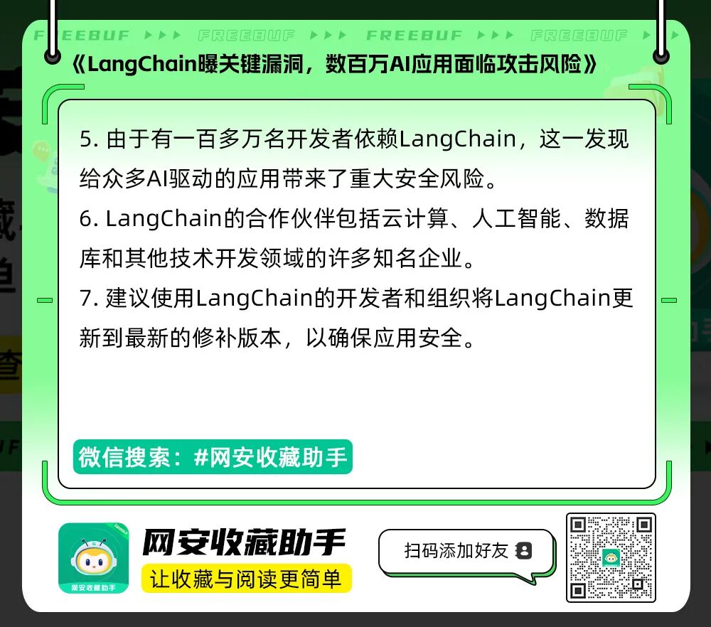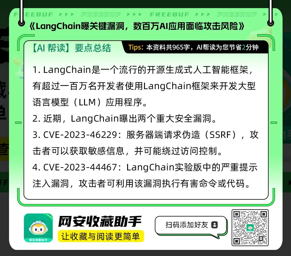 这些漏洞被识别为CVE-2023-46229和CVE-2023-44467,它们有可能允许攻击者执行任意代码和访问敏感数据。鉴于有一百多万名开发者依赖LangChain,这一发现给众多AI驱动的应用程序带来了重大安全风险。
