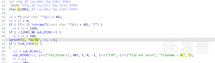 继续查找发现sub_D7A8函数在解析读取文件的请求时,直接将URI拷贝到栈空间s,s只有280字节大小,也存在栈溢出漏洞。