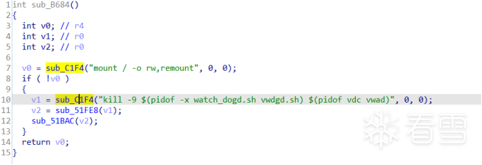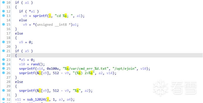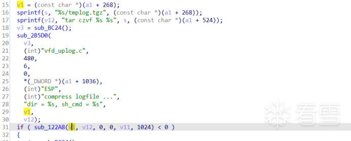 于是查找引用sub_12024函数的地方,sub_12280和sub_12294都不能控制参数,只有sub_122A8函数中参数似乎是可控的。sub_122A8函数中将a1参数拼接到“cd %s”命令中执行。