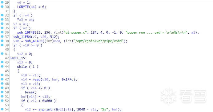 sub_C1F4函数内部调用sub_12024函数,sub_12024函数内部通过调用/opt/ejoin/var/pipe/vshd程序传递参数执行命令。