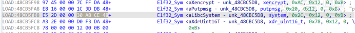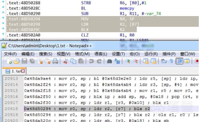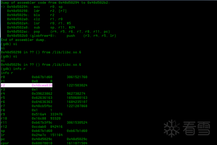 系统没有随机基址,漏洞利用较为简单,只需要避免字符串截断就行。因此直接从libc库中查找到MOV R0,SP; LDR R2,[R7]; BLX R2;指令的地址0x48d50294用来覆盖返回地址。