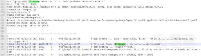 尝试构造http://192.168.0.1:8080/uplog.html?filename=/etc/;id/../../../etc/passwd&fileurl=123请求进行测试,发现代码中会对filename指向的文件是否存在进行判断,暂时没法绕过进行命令注入。